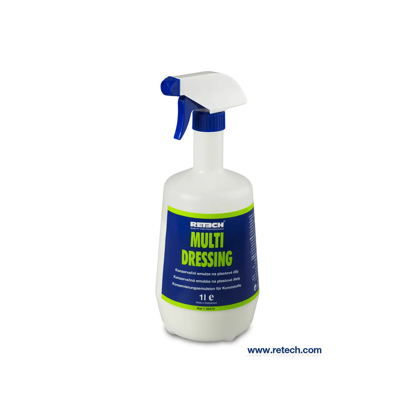 MULTI DRESSING е специална консервираща емулсия за пластмасови и гумени части. Може да се прилага в интериор и екстериор, а също и за обработка и съживяване на всички пластмасови части от двигателното отделение и гуми. Използваки за третиране на гумени части- повишава цвета им и им придава блясъка, от който се нуждаят. Получената степен на блясък може да се регулира чрез разреждане с вода.Парфюмиран.Напръскайте продукта в-ху третираната зона с помощта на пулверизатор или нанесете с гъба или парцал.Разпределете равномерно и оставете да изсъхне.