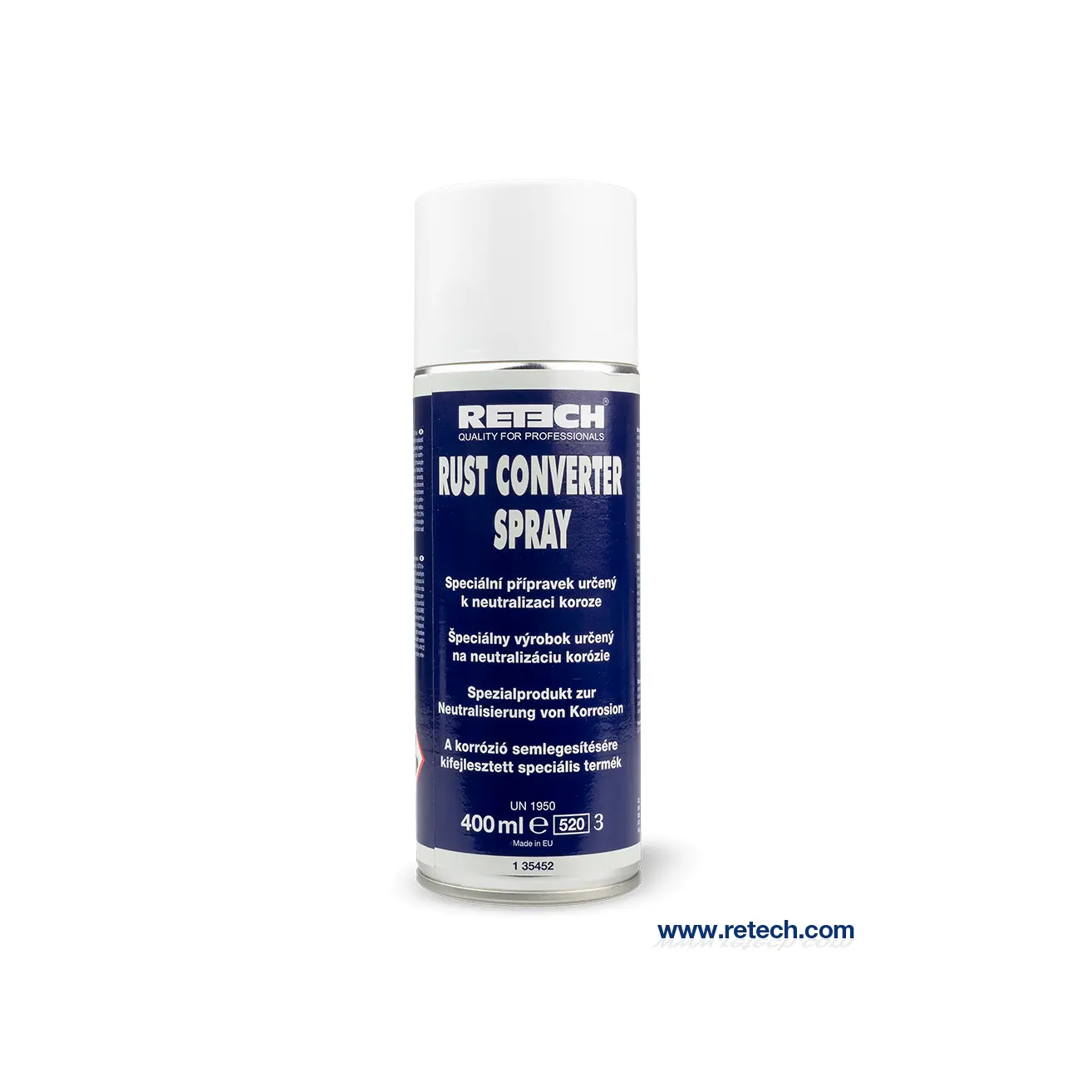 Спрей за неутрализиране на ръжда е революционен антикорозионен агент в спрей, специално разработен за неутрализиране на ръжда върху черни метали. Този професионален продукт от чешкия производител ReTech прониква дълбоко в повърхностната корозия, реагира химически с нея и я превръща в стабилен, неразтворим синьо-черен защитен филм – твърдо, лъскаво покритие с отлична адхезия.