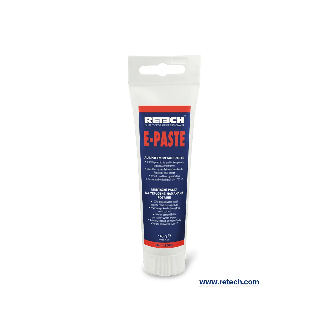 Специална паста на основата на водно стъкло за перфектно уплътняване на термично натоварени тръбни връзки. Повърхността на свързване също е 100% запечатана срещу въздействието на атмосферната влага, което улеснява демонтажа на връзките за подмяна или ремонт. Благодарение на високата си температурна устойчивост, E-PASTE се използва във всички индустриални сектори като монтажна паста за технологични тръбопроводи, във вериги за горещ газ, но също така и за свързване на изпускателни системи на моторни превозни средства. Не съдържа азбест и разтворители.