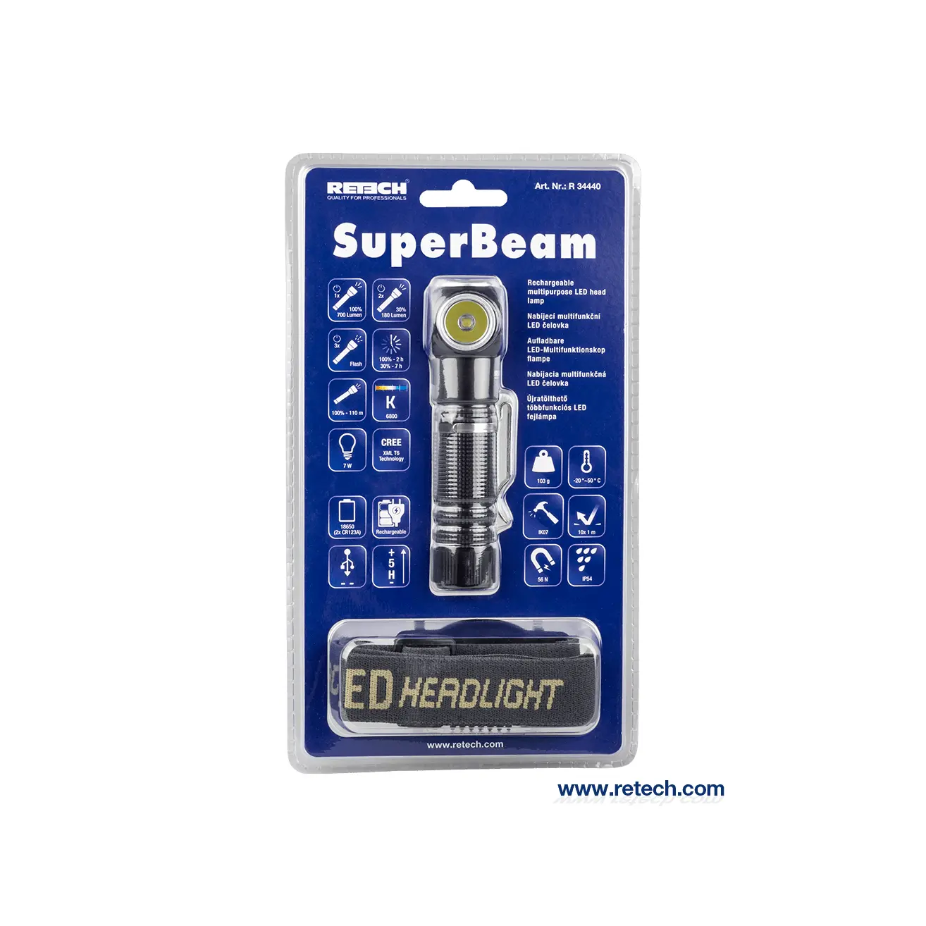 SuperBeam е професионален акумулаторен LED челник.Устойчивост на атмосферни влияния и механична устойчивост, лампата е подходяща за тежки операции както на закрито и открито. SuperBeam се прикрепя с лентата за глава и към всяка феромагнитна повърхност ,с регулируемата щипка, може да се зададе посока на осветление. Включване на фенера с помощта на бутона постепенно до 100% / 30% / стробоскопичен ефект / изключване.Зареждане чрез USB-C конектор